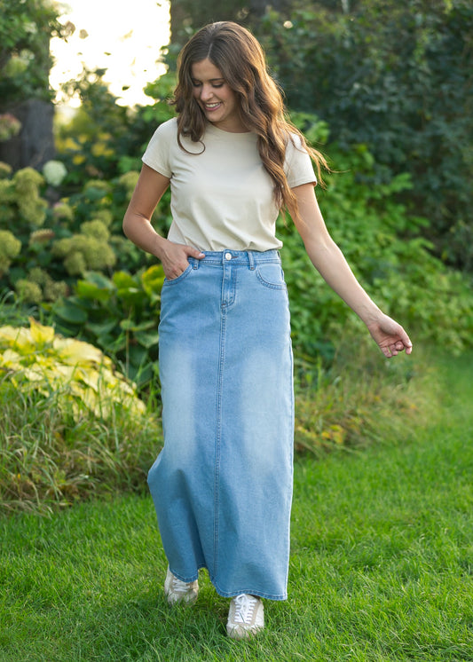 Welcome to our collection of denim skirts! Whether you're searching for a timeless staple like a long denim skirt for everyday wear or a stylish piece that transitions seamlessly through the seasons, we have just the skirt for you. Designed with modesty, comfort, and effortless style in mind, our women’s denim skirts offer the perfect blend of fashion and function, making them a must-have for any wardrobe.