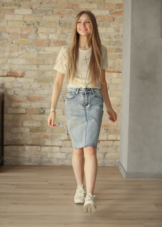 Our denim skirts bring a modern, casual edge to modest style. Crafted from durable denim, these skirts are perfect for everyday wear, pairing effortlessly with both classic tees and dressier blouses for a relaxed yet put-together look. For extra coverage with the same easygoing feel, browse our long denim skirts for styles that fall below the knee without sacrificing comfort or style.