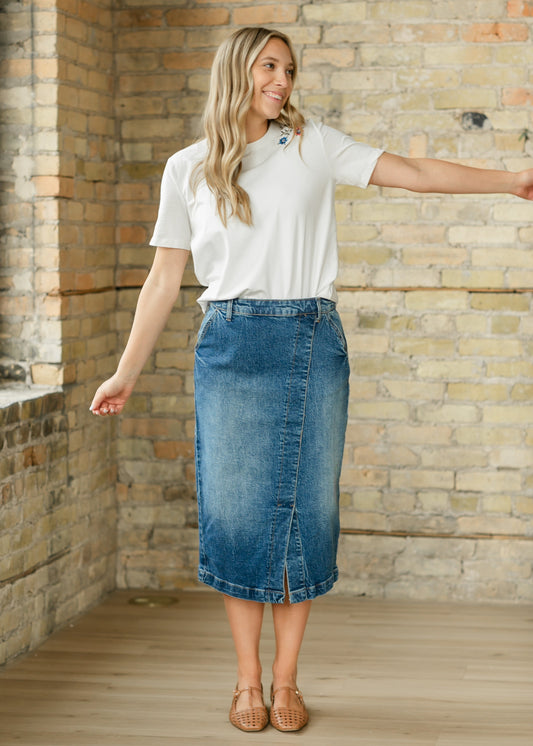 Crafted from sturdy, medium-weight denim, our midi skirts are made for long-term wear. High-quality stitching and reinforced seams ensure each piece maintains its shape and color wash after wash, becoming a reliable staple in your wardrobe.