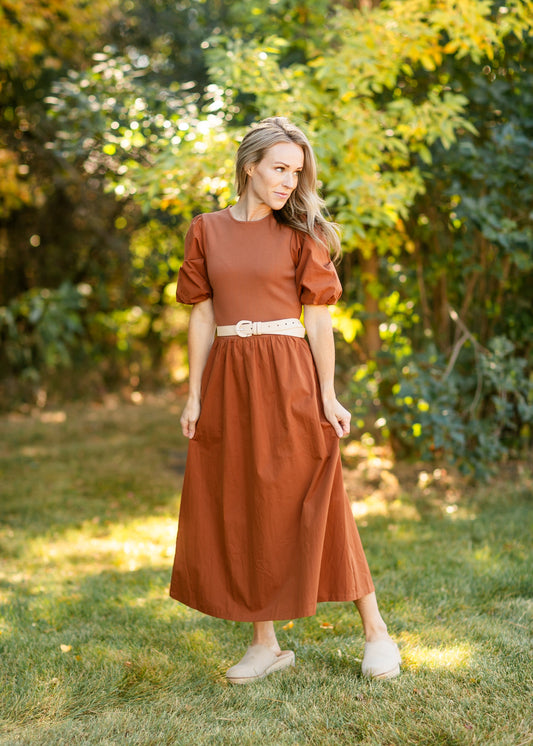 Puff Sleeve Cotton Knit Bodice Midi Dress - FINAL SALE