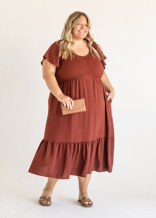 Smocked V-neck Flutter Sleeve Midi Dress - FINAL SALE