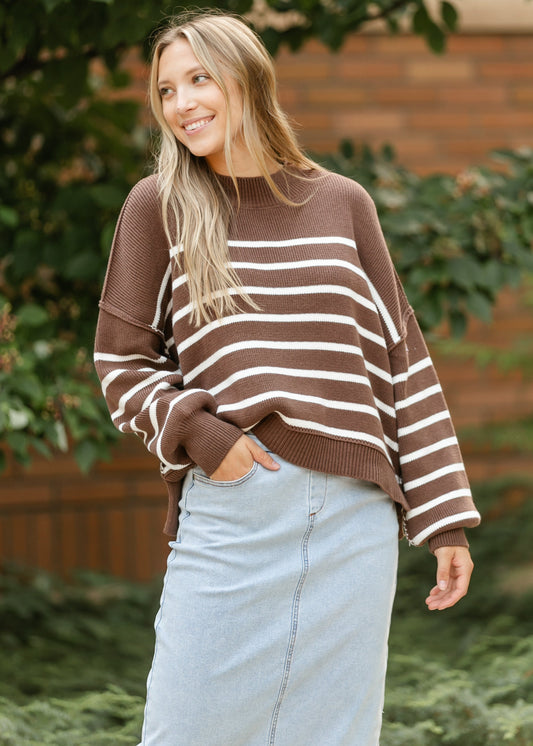 Brown Striped Crewneck Knit Sweater