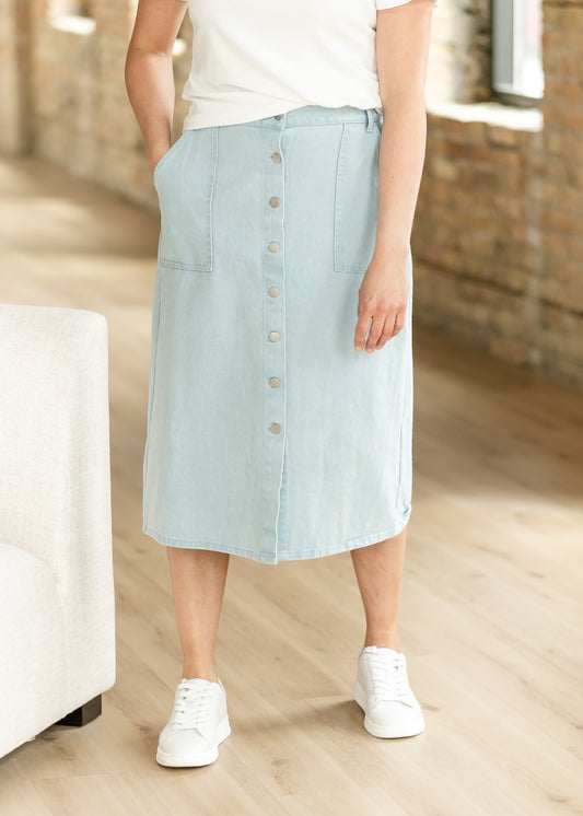 Natalia Button Front Washed Midi Denim Skirt - FINAL SALE4.3Rated 4.3 out of 5 stars6 ReviewsRegular price $24.99 USDRegular priceUnit price / per$48.00 USDSale price $24.99 USDLight WashBeigeSale