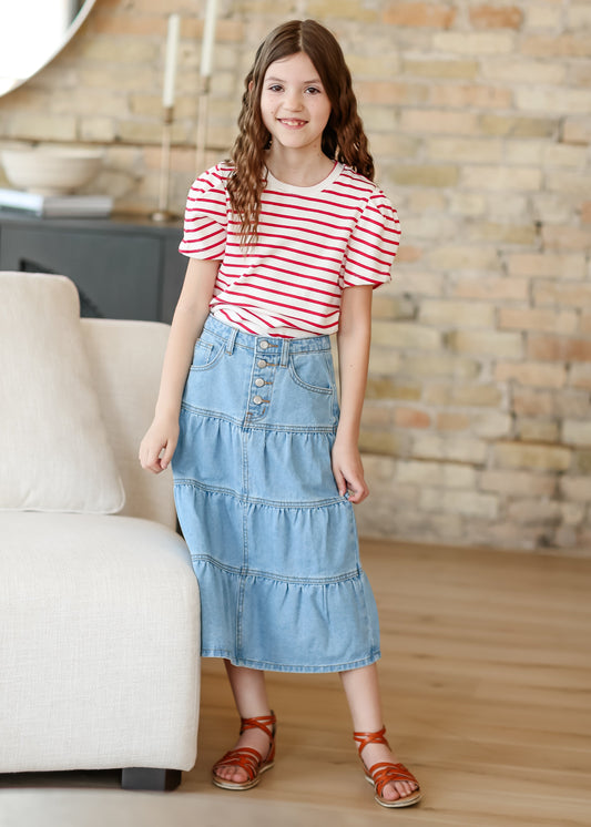 Girl's Button Fly Tiered Denim Skirt - FINAL SALE5.0Rated 5.0 out of 5 stars1 ReviewRegular price $27.99 USDRegular priceUnit price / per$38.00 USDSale price $27.99 USDSold out