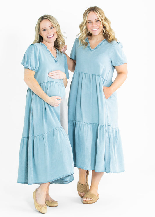 Ruffled V Neck Puff Sleeve Tencel Dress - FINAL SALE