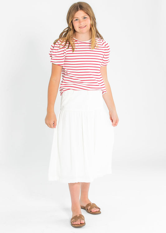 Girl's Pleated Puff Sleeve Stripe Knit T-Shirt
