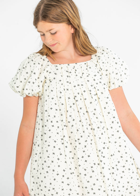 Girl's Ditsy Bow Print Box Pleated Puff Sleeve Dress